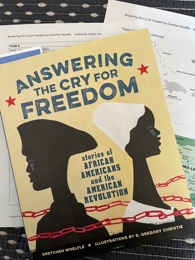 Answering the Cry for Freedom: stories of African Americans and the American Revolution by Gretchen Woelfle is assigned over 3 years, several chapters each term. I have written summaries of each reading assignment and included maps and words to define.