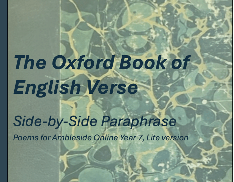 When I realized I was going to need the paraphrases, but still wanted to see the originals, I created this document. It includes all poems listed for AO7 Lite. The original poem is side-by-side with the AO paraphrase. And when available, I have links to YouTube readings of the original poems. This is my YouTube list.