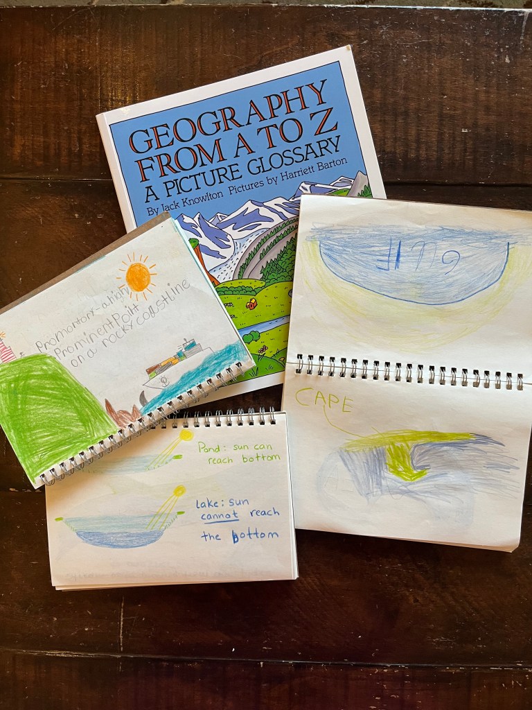 One day a week I (try) to schedule in geography journal time in which we all learn about a different geography term and then draw it in our journals. I am using the Geography from A to Z book. I’ve created a schedule of topics to cover instead of going alphabetically. I’d rather cover types of bodies of water all together than jump from Atoll to Badlands. My list of topics with links is in Other Guides.