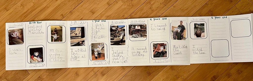 Once a week we work on Em’s personal timeline. I am using an idea from Lesley Manning at fromthecmtrenches. I have modified her timeline template a little and print a page for every year and tape it together to make a folding book. For each year of his life, he picks three pictures and writes a short description (which he usually talks me in to counting as copy work). Each week E picks one picture. In my weekly planning I go through my photos from the that year and print out a variety of pictures for him to choose from and have those ready for him to cut out and paste into the timeline. Though as we’ve gotten closer to the current year he sometimes requests a specific picture that he remembers. He looks forward to Wednesdays when we do the timeline. We both love to talk about things we remember and he enjoys hearing me tell stories about things he doesn’t remember.