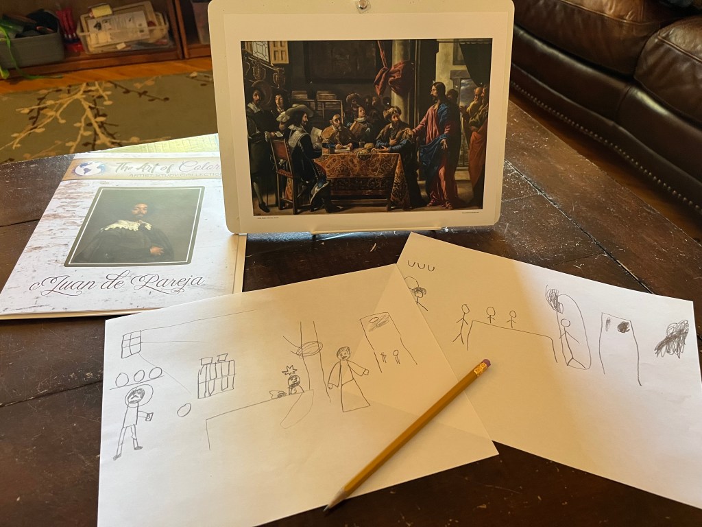 To do the actual artist study, we look at the picture and discuss it. If the guide has any biographical information, we read a section every week. Some guides have information about the artwork, so we’ll read or discuss that as well. Some weeks when there is more time in the schedule we will hide the painting and each of us draw what we remember is in it – very basic stick figure kind of drawings just as a way of remembering or narrating what we saw. Most weeks I just cover it and we do an oral narration, taking turns talking about what we saw. Then I hang up the art above one of their desks, replacing the previous picture (we do not have wall space for more than one picture above each desk).