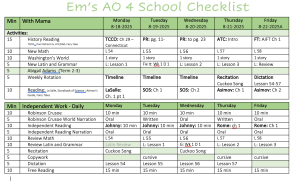 Though there are some basic similiarities with how I went through Year 4 with M and what Em will do, there are so many differences that I feel like I am planning for a completely new year I’ve never done. I’ve swaped out multiple books, either because Em did them earlier or I found ones I liked better. Also, Em is able to do much more independently than M did, so the daily schedule for Em’s year 4 looks a lot different than the daily schedule M had. This is good news, because as Em is becoming independent, M still needs a lot of one-on-one help and read-a-louds.