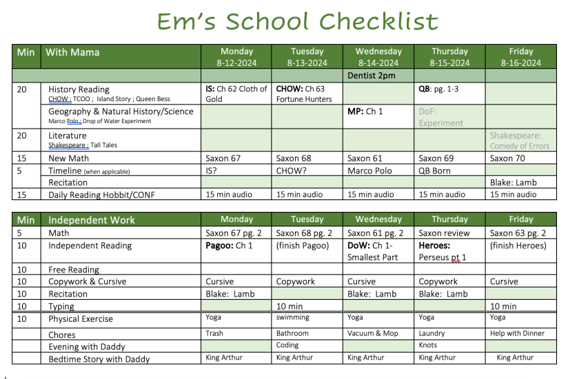 Every week I will make a weekly schedule for Em to follow (see Planning and Scheduling for further details). I plan out what he will do independently and what he will do with me and make sure it can all fit into the school time allotted. This is not all of his work since we also spend 45-60 minutes in Together Time first thing in the morning (Together Time template here).