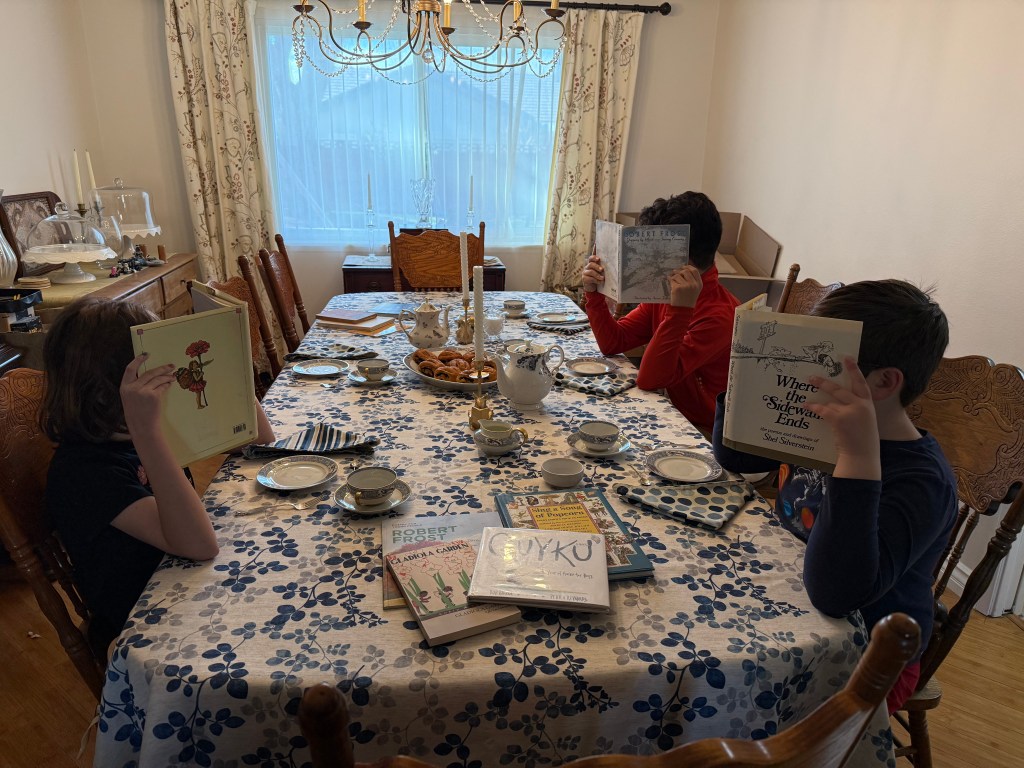 For Term 1, I ended up alternating between Frost and Blake during our Morning Time readings. In term 2 I just read a Sandburg poem three days a week, alternating with the Folk Song the other two days. I did this because our Morning Time was starting to run long and it was one of the things I changed. In Term 3, we read a Hughes poem three days a week. For the Frost, Sandburg, and Hughes poems, I read from the Poetry for Young People series. For Blake I read from Songs of Innocence and Experience. We also did an ocassional Poetry Tea Time where the boys choose any poetry books they want and read a favorite or new poem. Or request I read it. And often guests are invited.