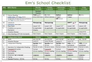 Unlike what I have had to do with M, this year I actually ended up adding in extra readings with Em. His (and my!) favorite part of the school day is when we cuddle in our oversided chair and I read aloud or we listen to an audiobook while he follows along in the book. The original weekly schedule had 20 minutes alloted for history or literature each day and then another 15 minutes of a “daily reading.” In reality, the 20 minute history/geography/literature readings rarely took that long. To give us more cuddle…er, reading time, by the end of the year I was scheduling two history/literature readings plus the “daily reading” slot. When we finished what was in the original 36-week plan, I found new books to add in to keep the schedule the same. Here is a sample of what the weekly schedule looked like by the end of the year.