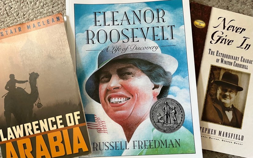Since Churchill will be in Term 1, and we’re not doing the other two books listed, I will be assigning Eleanor Roosevelt: A Life of Discovery by Russell Freedman in Term 2 and Lawrence of Arabia by Alistair Maclean in Term 3. I’ve written up a schedule and reading guide for each of these and posted them in Other Guides.