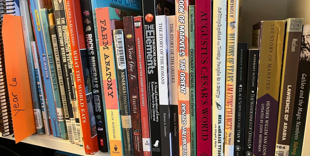 This year with M, I continued to work with him to figure out which types of (Special Ed) accommodations he needs to be able to do his best. Last year I recognized I would need to go more slowly through math and allow “cheat sheets.” This year I realized I would need to approach math completely differently. We have continued to develop how to help him best with narrations. This includes small prompts and allowing drawing in addition to written. I’ve also noticed that if he is coloring or drawing during the reading, he is able to look at a specific part of the drawing and remember what I was reading while he was drawing that part. M does very little school book reading on his own – either I read it to him or he follows along in the book while listening to an audiobook. He reads voraciously in his free time, but I’ve found that if I have him read a school book (even a novel) on his own, he reads it extremely slowly, or gets distracted. Listening to an audio version keeps him focused and able to finish the assignment on time.