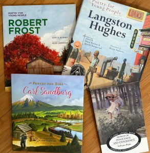 For Term 1, I ended up alternating between Frost and Blake during our Morning Time readings. In term 2 I just read a Sandburg poem three days a week, alternating with the Folk Song the other two days. I did this because our Morning Time was starting to run long and it was one of the things I changed. In Term 3, we read a Hughes poem three days a week. For the Frost, Sandburg, and Hughes poems, I read from the Poetry for Young People series. For Blake I read from Songs of Innocence and Experience. We also did an ocassional Poetry Tea Time where the boys choose any poetry books they want and read a favorite or new poem. Or request I read it. And often guests are invited.