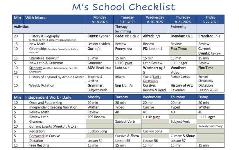 I have scheduled Citizenship for 10-15 min each day of the week. We will follow the AO schedule for Ourselves and Penny Candy. I’ve also included Fallacy Detective in the Citizenship category (though AO places it in Logic, it just fit in the schedule in the Citizenship slot.) I will read each on one day per week. The fourth day I will review with M what he has written for his Current Events narration. For Current Events, we will continue to watch The World From A to Z daily in morning school and subscribe to The Week Jr (which they read in free time). M will be assigned to write a summary of something from watching or reading the news that caught his attention that week. The citizenship slot for the fifth day will be a flex day to catch up with any readings we did not get finished on the assigned day.